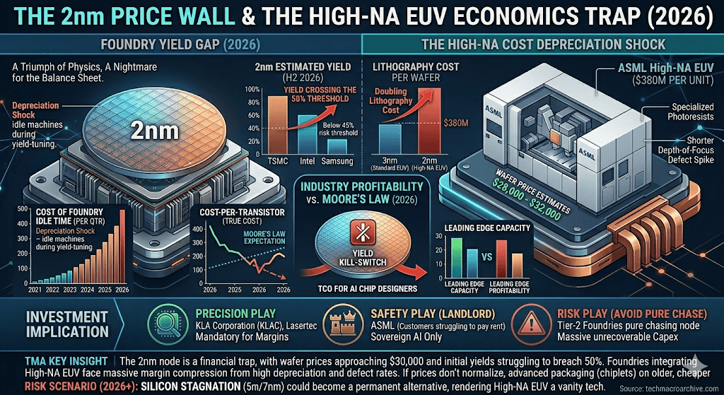 The market assumes that better resolution (0.55 NA) automatically equates to better business. It doesn’t. In 2026, the friction lies in the Depreciation Shock. Foundries like Intel and Samsung, who integrated High-NA early to leapfrog TSMC, are finding that the throughput of these machines hasn’t scaled linearly with their cost. For the first time, the “Cost-per-Transistor” is trending upward, breaking a 50-year streak of Moore’s Law economics.