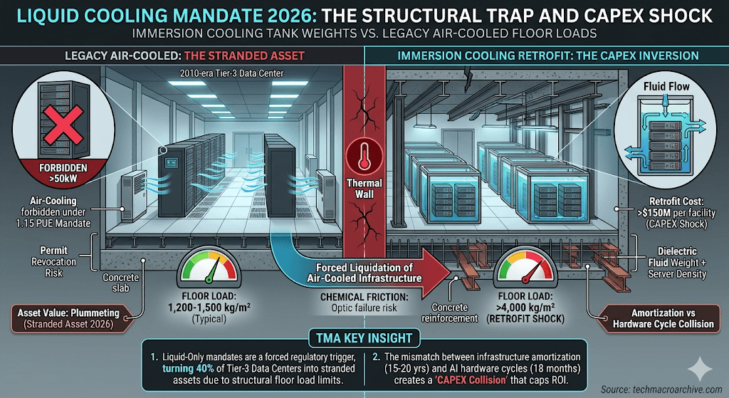 Liquid Cooling Mandate 2026, Data Center Retrofit CAPEX, Immersion Cooling TCO, Stranded Data Center Assets, AI Infrastructure Thermal Wall, PUE Regulation 2026