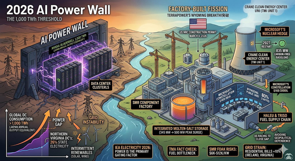 In 2026, the AI boom hits the “Power Wall.” Discover how Microsoft, Amazon, and TerraPower are utilizing SMRs and nuclear restarts to secure the energy-dense future of compute.